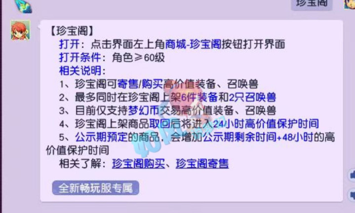 梦幻西游畅玩服也拥有自己的交易平台,那就是“珍宝阁”,珍宝阁与藏宝阁最大的区间,就是目前仅支持用梦幻币交易高价值装备和召唤兽。